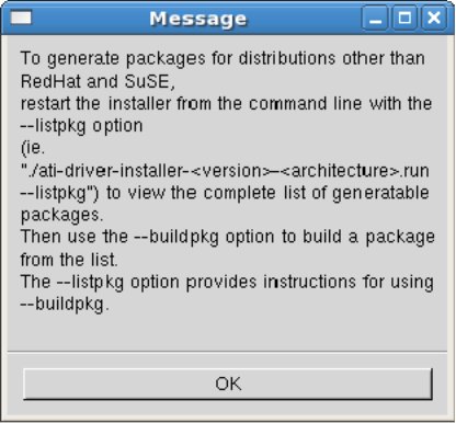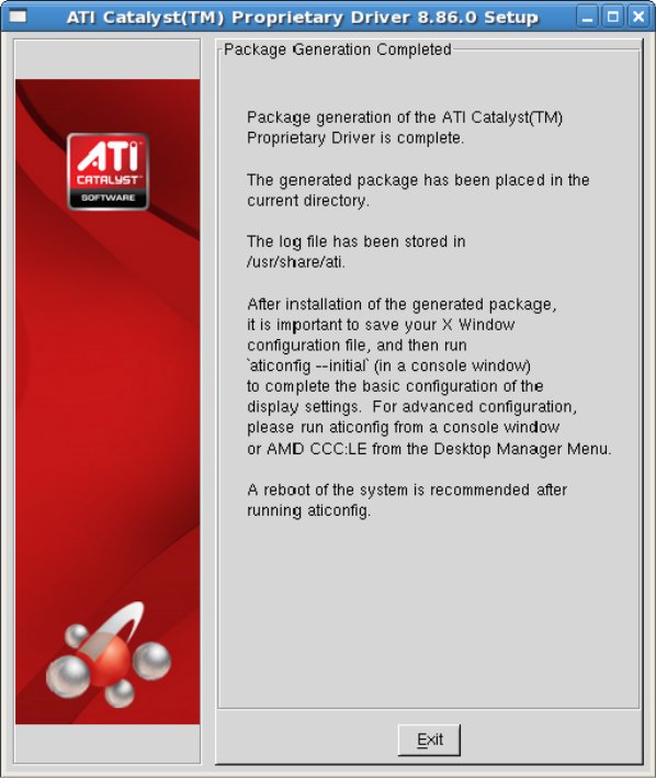 項目「Generate Distribution Specific Driver Package」を選択することで、自身の Linux 配布版に誂えられたインストールパッケージを簡単に生成できる。オペレーティングシステム製作者が定めた動作規則の利用を通じて、特定の Linux 配布版への最適化が実現されている。「Generate Distribution Specific Driver Package」を使って「AMD Catalyst proprietary driver」をインストールするには以下の手順に依る。
