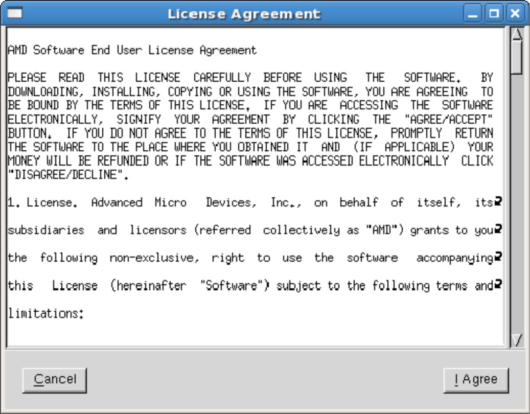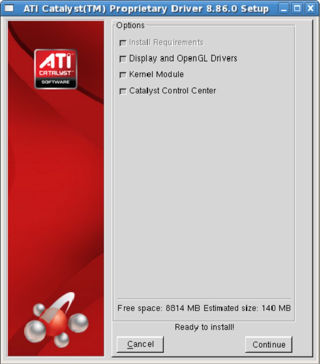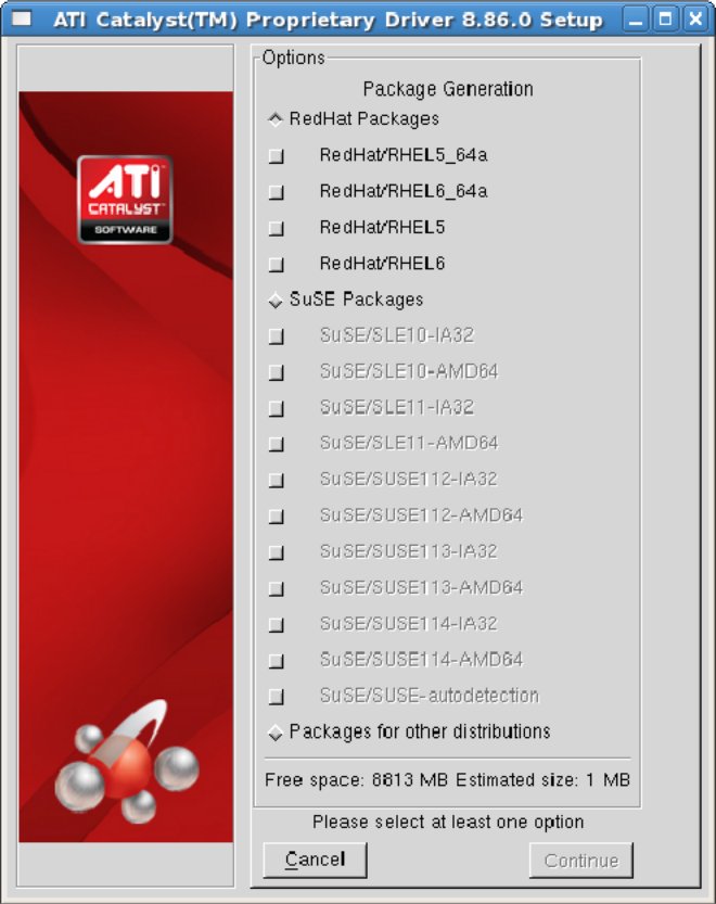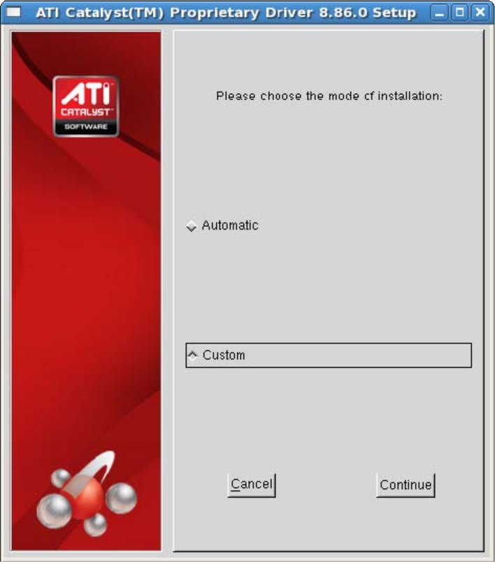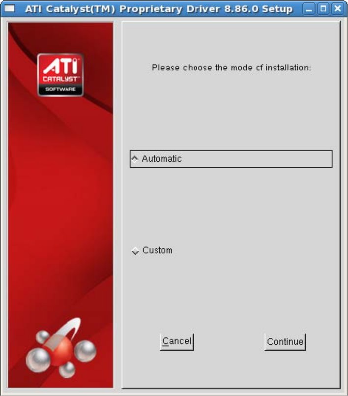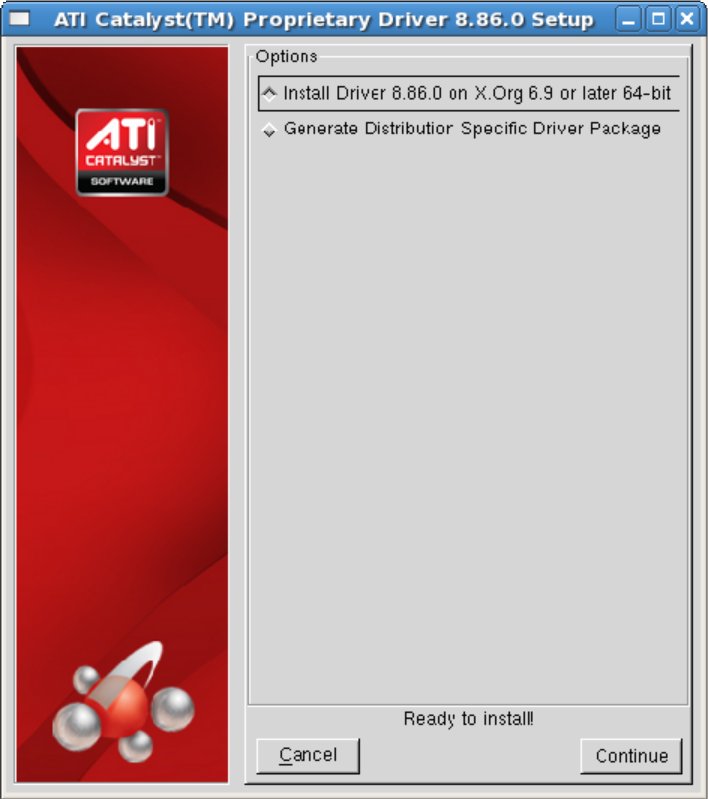 「AMD Catalyst Installer for Linux」は「AMD Catalyst proprietary driver」のインストールを簡単な操作で行えるようにする。「AMD Catalyst installer」は2種類のインストール方法を用意している。簡単にドライバの設定処理を行うには「Install Driver」を選ぶ。自身の Linux の配布版に合ったインストールパッケージを生成し、それを使ってインストールしたいなら「Generate Distribution Specific Driver Package」を選ぶ。