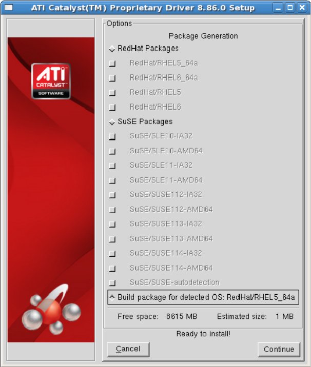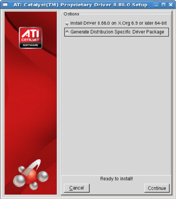 項目「Generate Distribution Specific Driver Package」を選択することで、自身の Linux 配布版に誂えられたインストールパッケージを簡単に生成できる。オペレーティングシステム製作者が定めた動作規則の利用を通じて、特定の Linux 配布版への最適化が実現されている。「Generate Distribution Specific Driver Package」を使って「AMD Catalyst proprietary driver」をインストールするには以下の手順に依る。